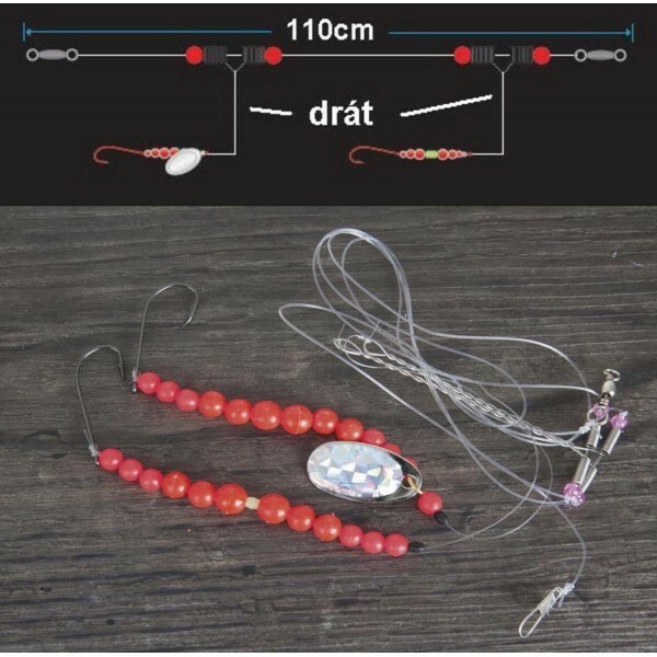 Hlavní vlasec je osazen dvěma háčky 2/0, jsou umístěny na ocelovém rameni, které dovoluje nástraze rotovat okolo vlasce bez zamotání. Systém je vybaven několika bílými korálky a třpytkou. Je neodolatelný pro všechny druhy platýsů.110cm1/0,0,50mm5310021 číst celé