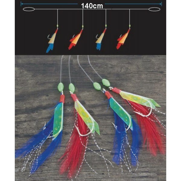 Systém pro lov makrel spěti háčky. Nad háčkem jsou bílé korálky a na háčku je bílá imitace rybí hlavičky a fluorescenční folie s bílými střapci.140cm1/00,60mm5311040 číst celé