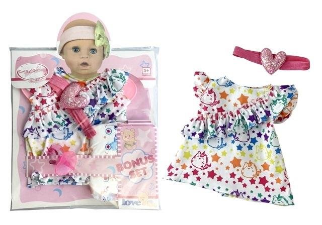 Ubranko dla lalki. W skład wchodzi sukienka, opaska oraz smoczek i pielucha. Zestaw pozwoli urozmaicić zabawę dziewczynkom i sprawi, że zabawa ich ulubioną lalką nie będzie już monotonna. Produkt dla dzieci od 3 lat. Podane wymiary są wymiarami opakowania. Zabawka zapakowana w przezroczysty... číst celé