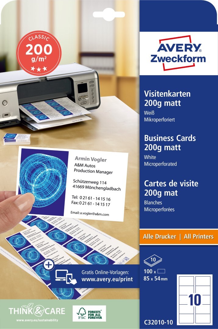 Avery Zweckform C32010-10 Vizitkový papír 85x54 mm, 200g/m2, 10 archů, 100 ks