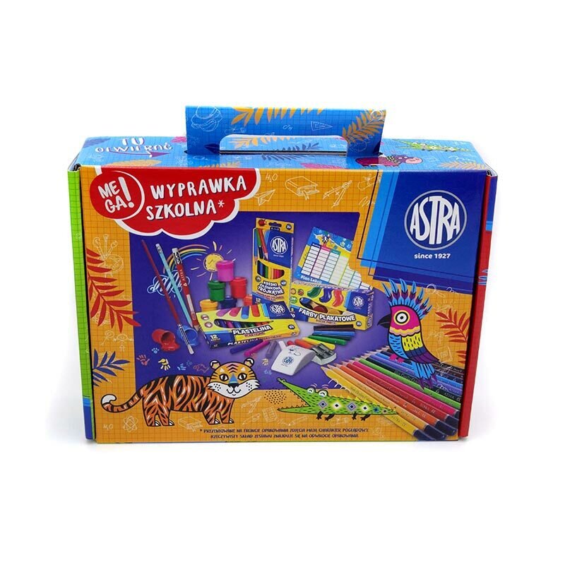 Zawartość:- farby plakatowe Astra 6 kolorów (20ml),- gumka do ścierania Astra Smart S,- kredki ołówkowe trójkątne Astra 12 kolorów,- ołówek do nauki pisania Astra,- ołówek pastelowy HB z miarką i gumką,- pędzel szkolny ogrągły Astra nr 8,- temperówka aluminiowa z dwoma otworami Astra,- plastelina...