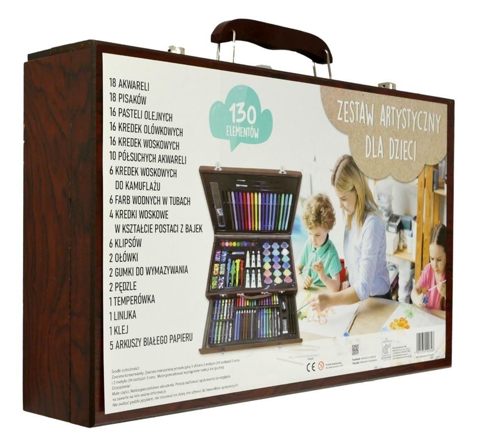 Skład zestawu 130 elementów:18 szt. pisaków18 szt. farb wodnych16 szt. kredek pastelowych16 szt. kredek drewnianych16 szt. kredek woskowych10 szt. farb akwarelowych6 szt. kamuflaż - kredki woskowe6 szt. farb wodnych w tubach4szt. kredek woskowych ozdobnych6 szt. klipsów2 szt. ołówków2 szt. gumek2...