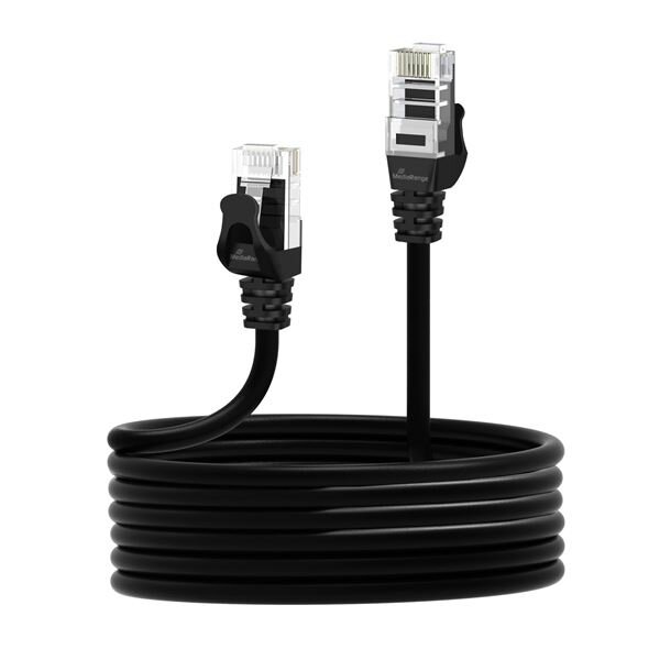 Černý, 10 m dlouhý síťový kabel MediaRange, UTP CAT 6 (1Gbps), konektor RJ45 se zacvakávacími zámky;Síťový kabel zajišťující optimální datové přenosy s maximální rychlostí až 1 Gbps;Vysoce kvalitní a robustní kabel zaručující vynikající připojení pro vaši síť;Konektory RJ45 se zámky na obou...