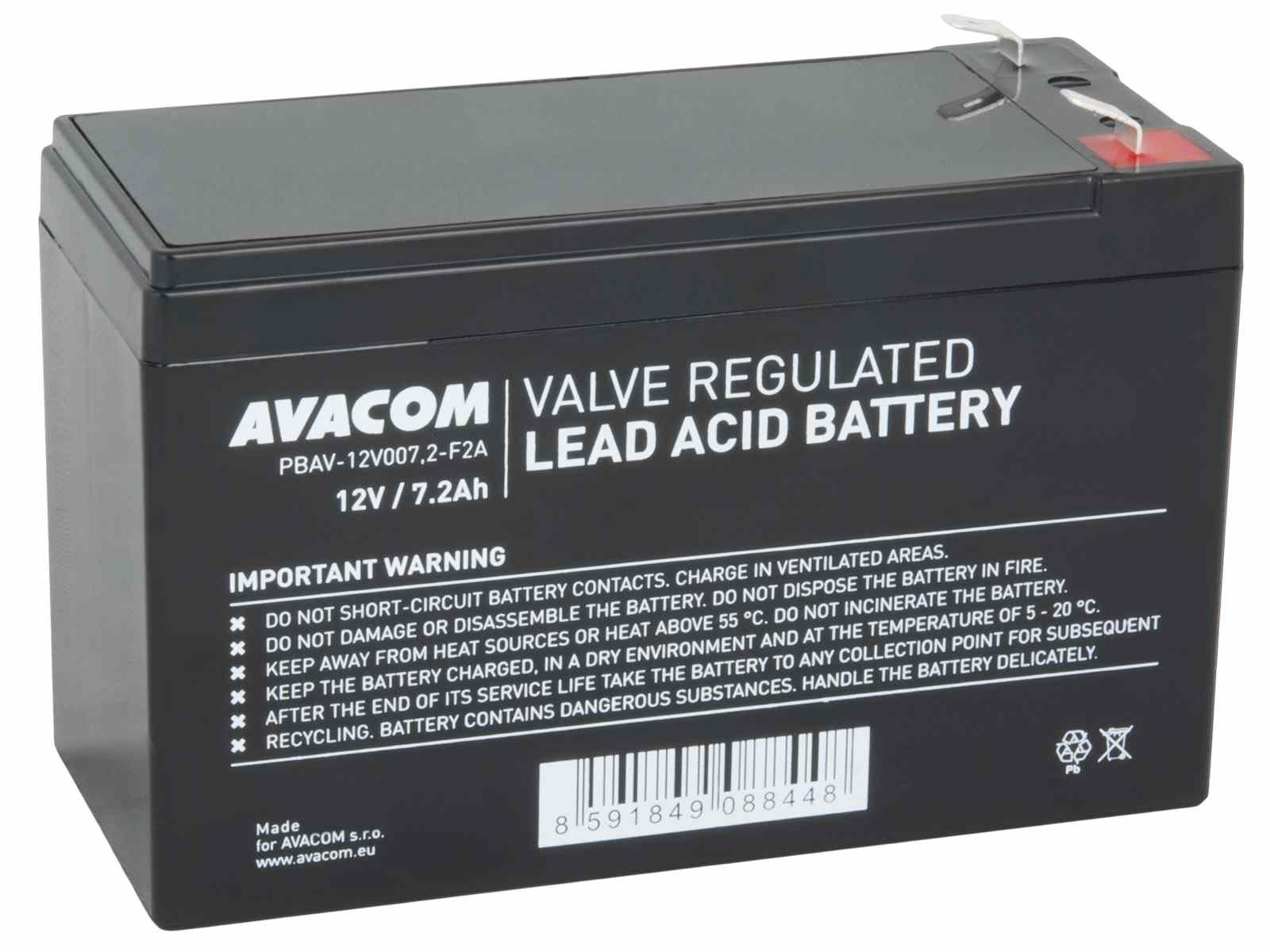 AVACOM baterie je typu VRLA (Ventilem řízený olověný akumulátor) s technologií AGM, která zajišťuje bezpečný provoz bez úniku elektrolytu a možnost instalace v libovolné poloze. Tento bezúdržbový akumulátor nabízí kapacitu 7,2 Ah při napětí 12 V a díky kvalitnímu provedení je odolný vůči otřesům.