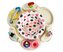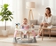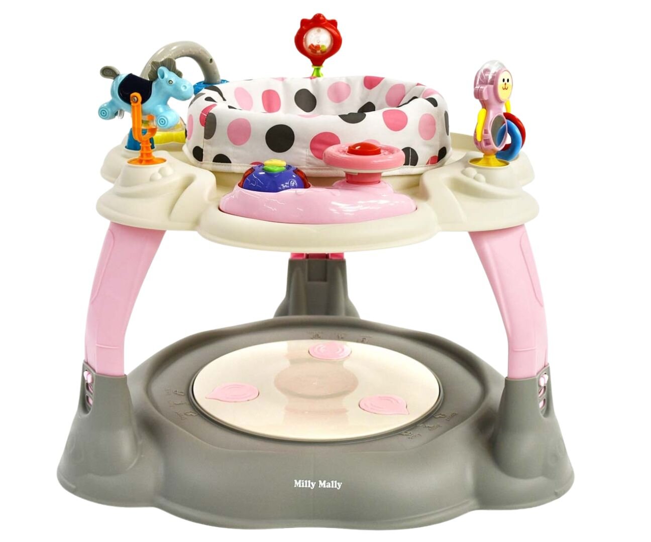 Siedzisko obraca się o 360°, co umożliwia maluchowi dostęp do wszystkich atrakcji znajdujących się na blacie. Ruchome elementy, różnorodne faktury i żywe kolory stymulują zmysły dziecka, rozwijając jego koordynację wzrokowo-ruchową oraz zdolności manualne. Wśród zabawek znajdują się m.in. grzechotki, obrotowe figurki i elementy dźwiękowe, które zachęcają do odkrywania i eksperymentowania.