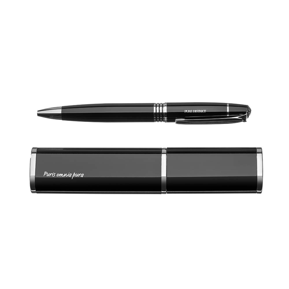 PURE DISTRICT ORIGIN Kuličkové pero v designovém hliníkovém pouzdře vypadá velmi elegantně. Pero s modrou náplní je lehké v ruce a hezky se s ním píše. Na pouzdru nesmí chybět motto našeho konceptu: PURIS OMNIA PURA (Čistému vše čisté). Naše zkušenost: Už neztrácíme propisky, protože máme jedno...