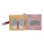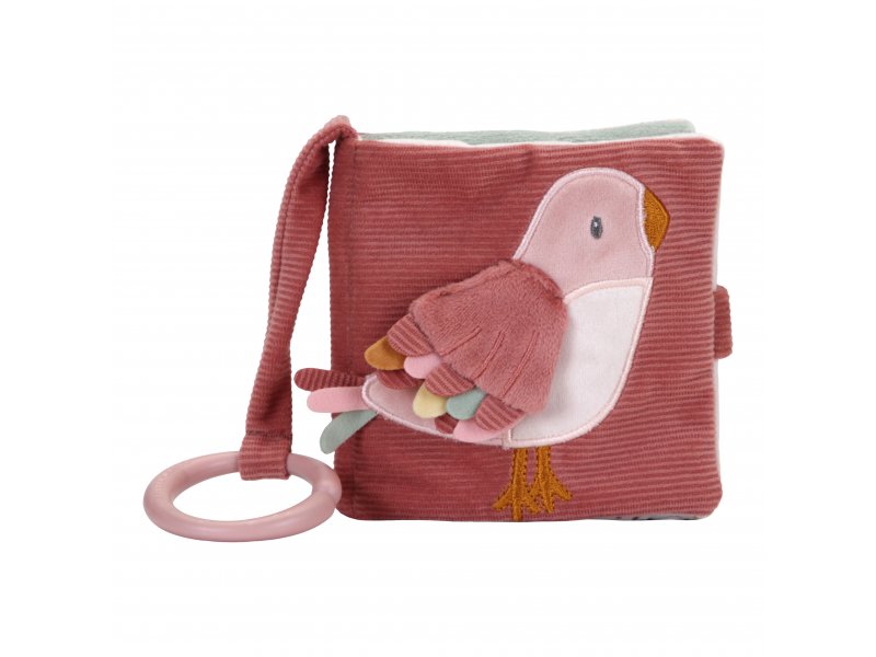 Textilní knížka s krásnými motivy květin a motýlů zaujme dítě šustícími a pískacími stránkami, stejně jako bezpečným zrcátkem uvnitř. Je navržena tak, aby se snadno zavěsila na kočárek, autosedačku nebo postýlku, což usnadňuje její použití na cestách i doma.