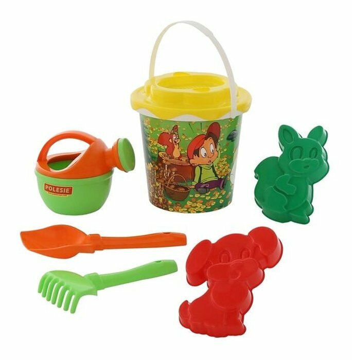 Polesie 5112 Zestaw do piasku Nr338 wiaderko z nalepką, sito Słonko, łopatka Nr5, grabki Nr5, foremki (wiewiórka + piesek), konewka mała Nr4