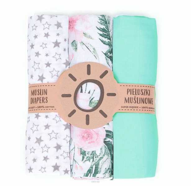 Mušelínové plenky 3ks + žínka zdarma - mátová, šedá, květy