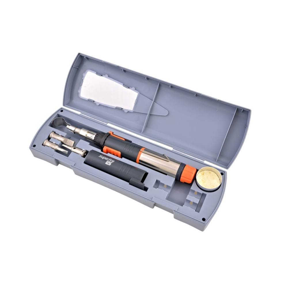 Profesionální 5-dílna sada s páječkou SuperPro 125 vydrží v provozu až 2 hodiny. Sada v praktickém boxu obsahuje: horký nůž, horkovzdušný hrot a reflektor, stojánek, pájecí hrot 2,4mm a houbičku pro čištění hrotů.Doba nahřívání: 30sec od zapáleníSrovnatelný výkon s elektrickou páječkou: 25..130W...
