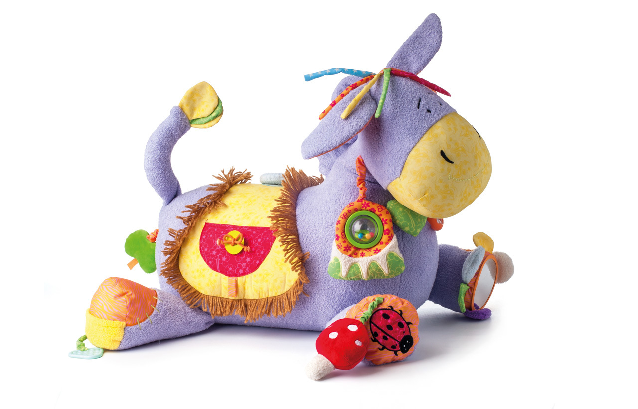 Plyšové hrací centrum v podobě oslíka Lakiho je určené pro všechny malé zvídavé děti. V jeho ocásku je všitý materiál, který při dotyku vydává zvuk mačkaného papíru. Všechny části jeho těla obsahují další hrací prvky jako jsou kousátka, pískátka a chrastítka. Na přední nožičce je umístěno zrcátko...