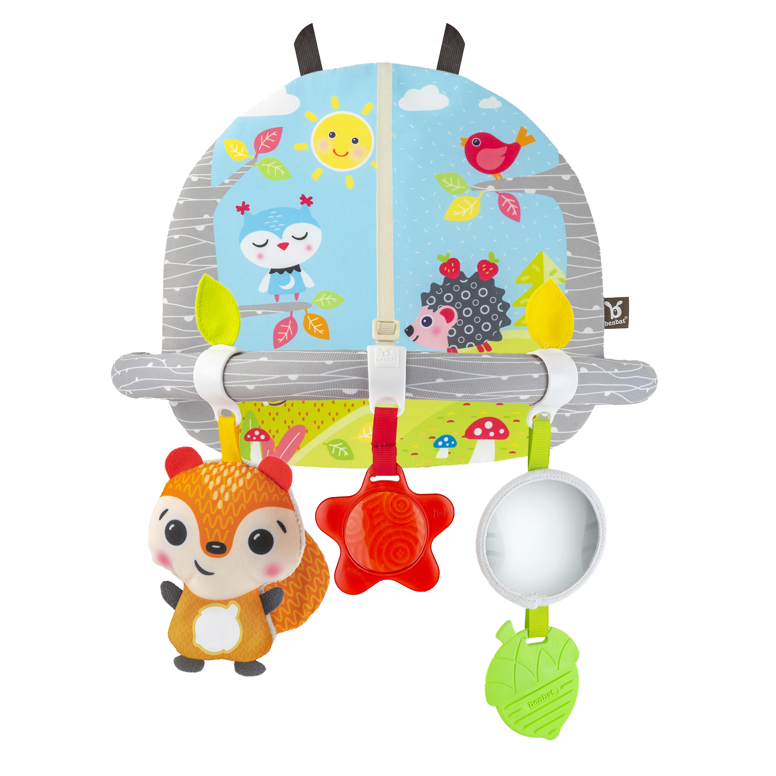 Dvoufázové aktivity centrum s plyšovými hračkami BenBat je určené pro děti jedoucí proti směru jízdy. Polohu oblouku a hraček lze upravit podle růstu, vývoje a preferencí dítěte. O zábavu se postarají tři hračky - liška se svítícím bříškem a šustícím ocasem, kousátko se zrcátkem a dazzle...