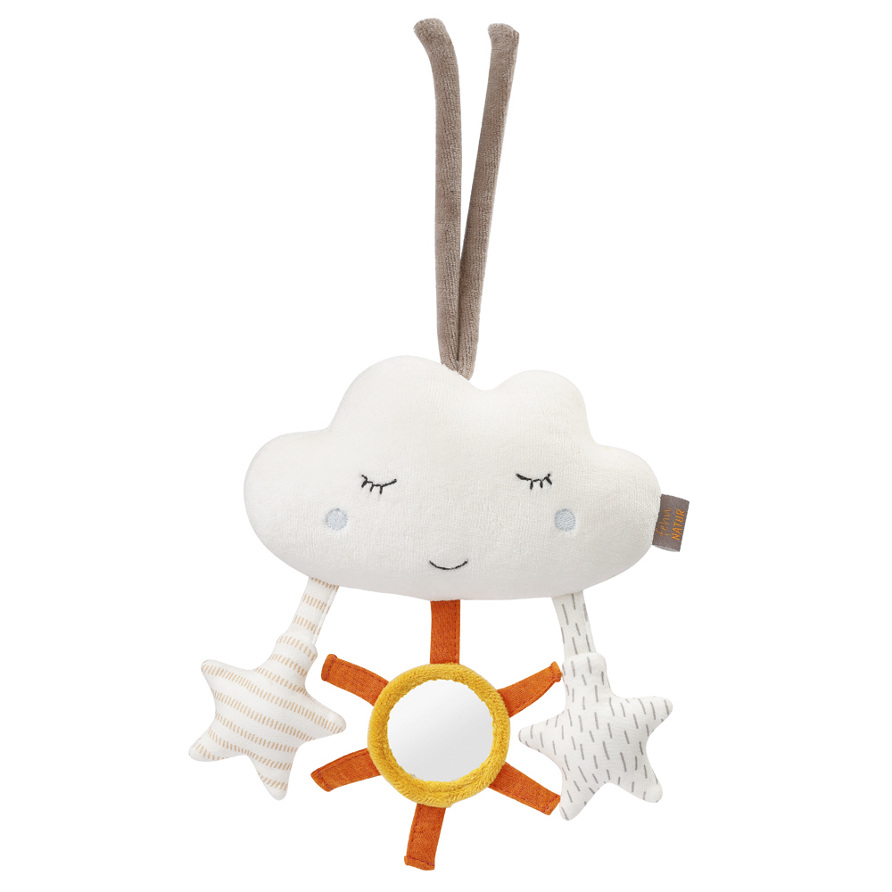 Měkký mráček z organické bavlny se stane milým kamarádem vašeho dítěte. Díky plyšovým hvězdičkám s šustícím papírem a plyšovému sluníčku s chrastítkem nabízí zábavu a zároveň podporuje rozvoj úchopu, hmatu, jemné motoriky, fantazie a koordinace pohybů. Praktické poutko umožňuje snadné připevnění na postýlku, kočárek nebo autosedačku, takže je vždy po ruce a zabaví děťátko i na cestách.