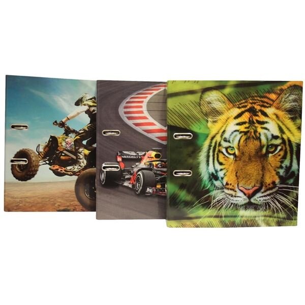 Designový pákový pořadač;Vhodné pro formát dokumentů A4;Povrch: lesklá laminace;Páková mechanika;Prstokroužek pro snadný úchop;Radokroužek proti samovolnému otevření;Design: mix motivů (čtyřkolka/formule/tygr);Šířka hřbetu: 7,5 cm;Výběr motivu je náhodný číst celé