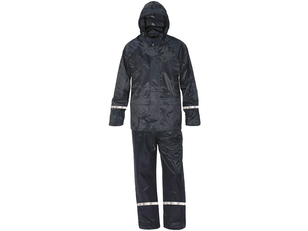 Oblek je vybaven kapucí ukrytou v límci, která dokonale chrání hlavu před deštěm. Zapínání na zip umožňuje snadné oblékání a svlékání, zatímco stahování v dolním okraji zajišťuje perfektní přilnavost k tělu a zabraňuje pronikání vody. Pro lepší komfort a odvětrání je oblek doplněn o větrací otvory na zádech a v podpaží. Kalhoty mají pružný pas, který usnadňuje pohyb a zvyšuje pohodlí při práci nebo aktivitách venku.