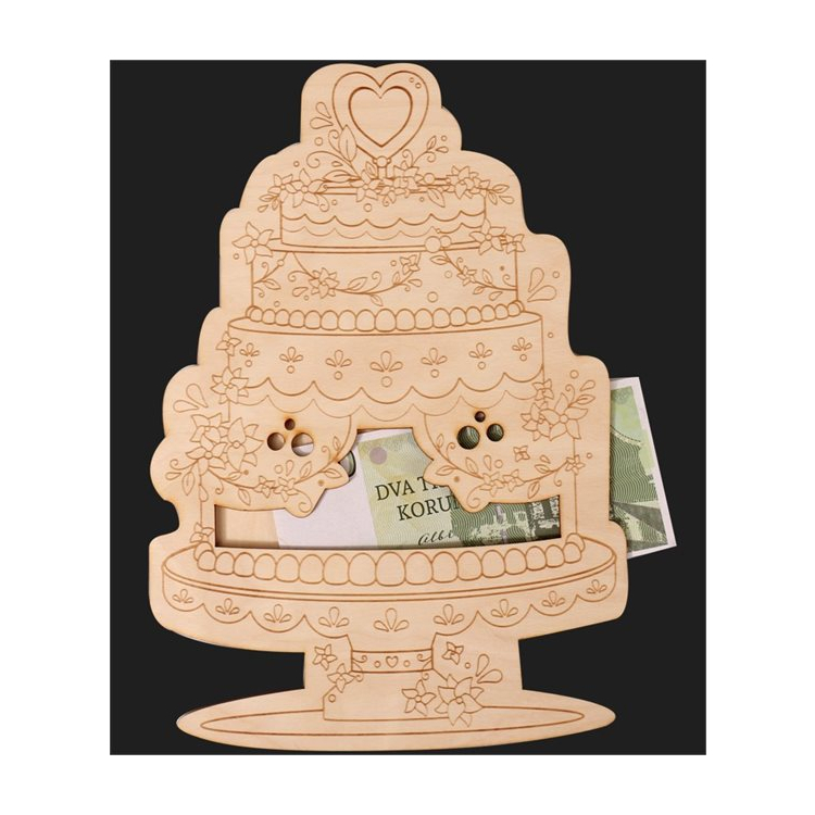 Svatební kapsa na peníze - Dort je perfektním způsobem, jak stylově a s láskou předat peněžní dar. Už žádné obyčejné obálky - tato dřevěná kapsa s elegantním svatebním motivem ve tvaru dortu udělá dojem a vaše přání novomanželům zůstane vzpomínkou.