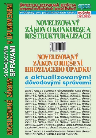 Zákon č. 7/20205 Z.z. o konkurze a reštrukturalizácii bol zásadne novelizovaný zákonom č. 309/2023 Z.z. Väčšina z cca 150 novelizačných bodov mala nadobudnúť účinnosť k 1.1.2025, no vzhľadom na nepripravenosť príslušných orgánov a inštitúcií na zavedenie centralizovaného elekronického systému...