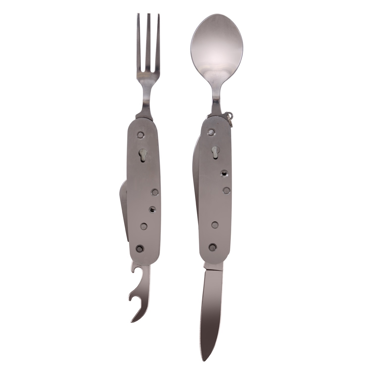 Skládací příbor - nůž, vidlička, lžíce, rozložitelný na dva kusy. Součástí je i otvírák na lahve a otvírák na konzervy. Materiál - nerezová ocel, rozměry ve složeném stavu cca 89 x 32 mm. Včetně pouzdra. číst celé