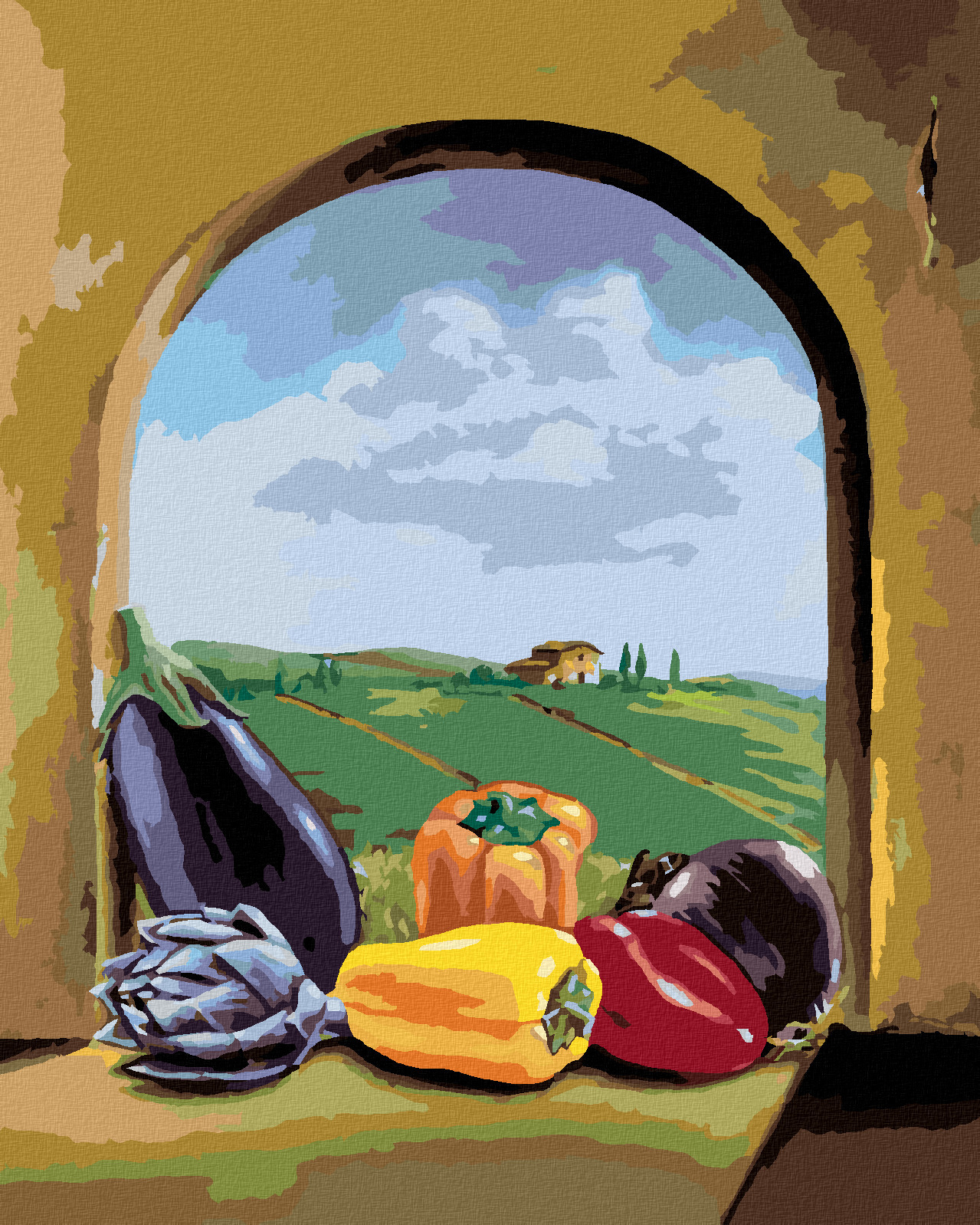 Malování podle čísel - MIX ZELENINY NA OKNĚ S VÝHLEDEM NA KRAJINU - 80x100 cm, bez rámu a bez vypnutí plátna