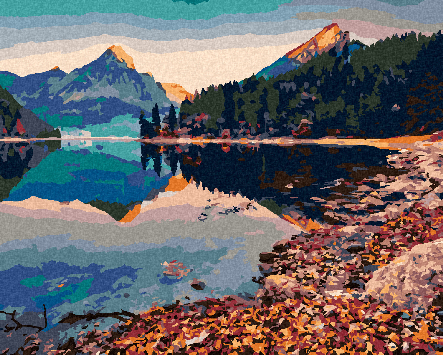 Malování podle čísel - DVA VRCHOLY HOR ODRÁŽEJÍCÍ SE V JEZERU - 40x50 cm, bez rámu a bez vypnutí plátna