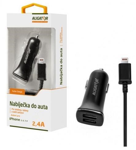 Aligator nabíječka do auta Turbo charge, 12/24 V, 2,4 A, Lighting konektor, 2x USB výstupNová výkonná nabíječka do auta řady "Turbo charge" v černém provedení je vybavena dvěma USB porty a Lighting kabelem.Tato nabíječka je ideálním pomocníkem pro dobíjení mobilního telefonu a jiných zařízení...