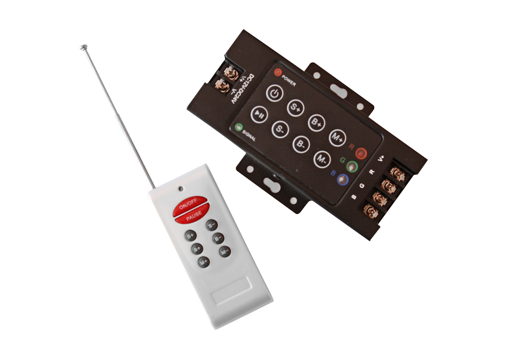 3-kanálový bezdrátový ovladač pro LED RGB světelné pásky. Slouží pro regulaci jasu, nastavení požadovaných barev a barevných přechodů. Ovládací jednotka je vybavena bezdrátovým radiofrekvenčním ovladačem, možnost manuálního ovládání. 7 přednastavených barev, nastavení jasu, 17 pevných programů...
