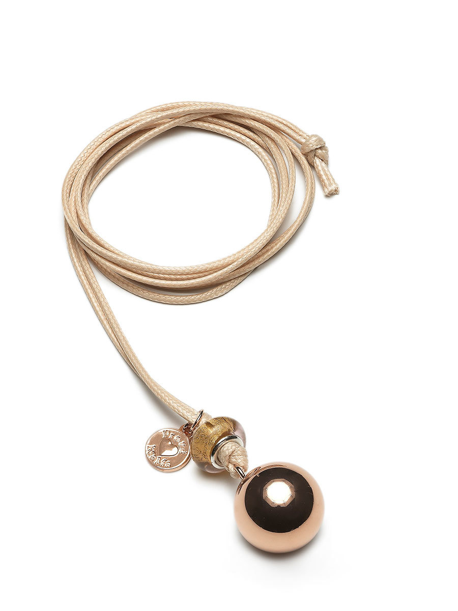 Mexická bola – kulička, barva růžové zlato / béžová, materiál kov / šňůrka, délka 120 cm, váha 15 g. Miminko v bříšku vnímá zvuky už od 20. týdne těhotenství. Jemné cinkání na bříšku má uklidňující účinky jak na maminku, tak hlavně pro miminko. Po narození miminka lze bolu pověsit do jeho...
