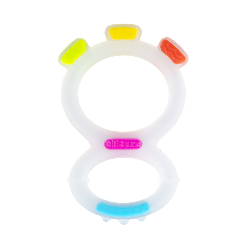 Dwa brzuszki ozdobione wypustkami przyniosą ulgę w ząbkowaniu! Ten zabawny gryzaczek wykonany został z silikonu, dzięki czemu bez trudu go wyczyścisz, aby zapewnić maluszkowi higienę, podczas korzystania z zabawki. Kształt Ósemki dopasowany jest do małych rączek, co ułatwi maluchowi chwytanie...