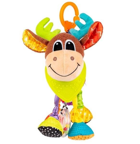 Zabawka stworzona zarówno dla małych domatorów, jak i ciekawych świata wędrowniczków! Przesłodki łosiek wyposażony został w praktyczny gryzaczek z wypustkami, w kształcie bandany, który przyniesie ulgę ząbkującym maluchom. Między kopytkami zwierzaka, kołysze się obręcz z grzechoczącymi...