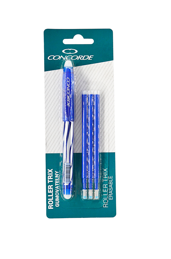 Roller CONCORDE Trix vás nadchne svým praktickým designem a inovativní funkcí. Napsaný text lze totiž vymazat zahřátím inkoustu, což umožňuje text následně přepsat. K vymazání slouží dvě koncovky z elastomeru, které jsou umístěné na konci těla tužky i na víčku. Pohodlný pogumovaný trojboký úchop zaručuje správné držení pera a komfort při psaní. Šíře stopy 0,7 mm je ideální pro čisté a přehledné písmo v jakékoli situaci. Modrá barva inkoustu odpovídá barvě těla, což vám usnadňuje orientaci.