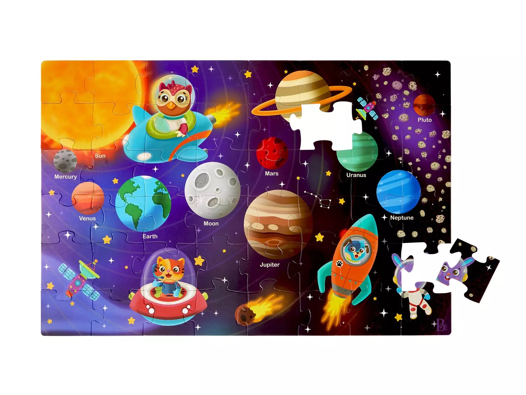 Připravte se na cestu vesmírem s maxi puzzle s krásnými ilustracemi sluneční soustavy, kosmických lodí a přátelských zvířecích astronautů! Extra velké díly z pevného kartonu tvoří plochu 91,4 x 60,9 cm a jsou tak ideální pro skládání na podlaze číst celé