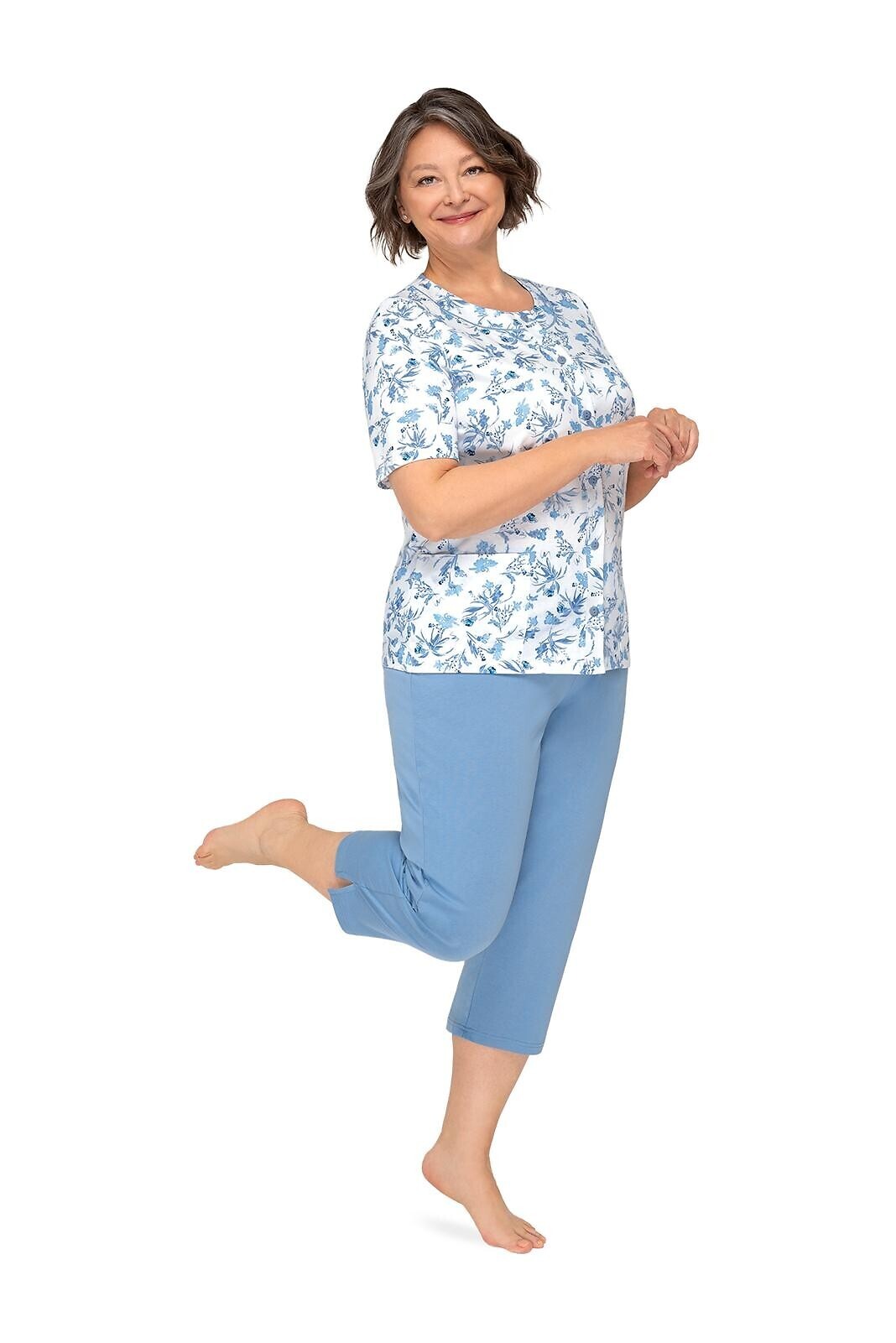 Piżama damska z delikatnej bawełny- koszulka zdobiona kwiatowym wzorem- z krótkim rękawem- półokrągły dekolt- zapinany na guziki- gładkie spodnie o długości 3/4 číst celé