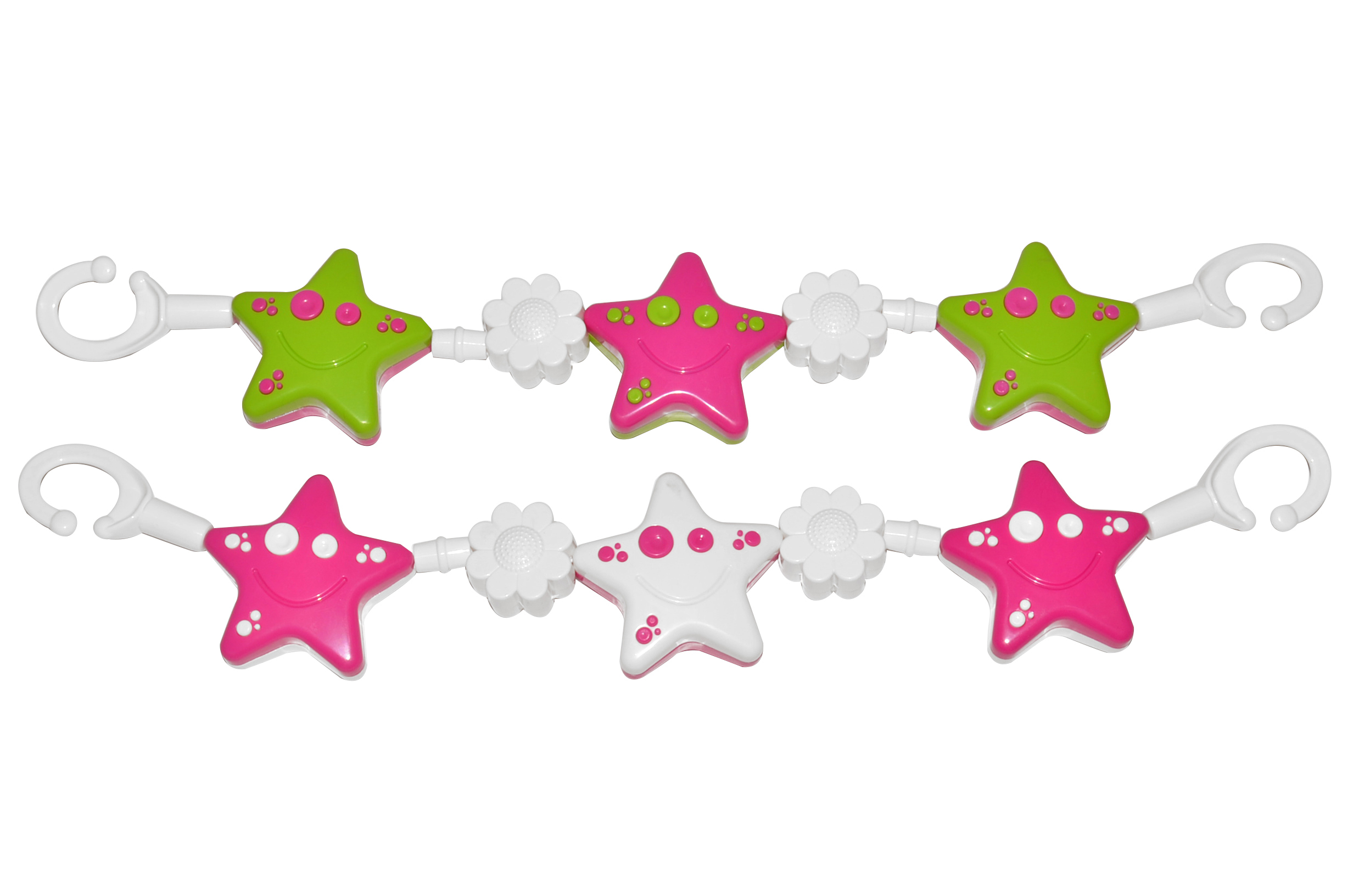 Tento řetěz je tvořen figurkami z tvrdého plastu, které jsou připevněné na mírně pružném lanku - díky tomu je snadné jej upevnit na jakýkoliv kočárek a zároveň poskytuje dostatečnou pružnost při hraní. Barevné a přitom jednoduché tvary hvězd a kytiček nejen zabaví maličkého pasažéra, ale také podporují jeho smyslový rozvoj.