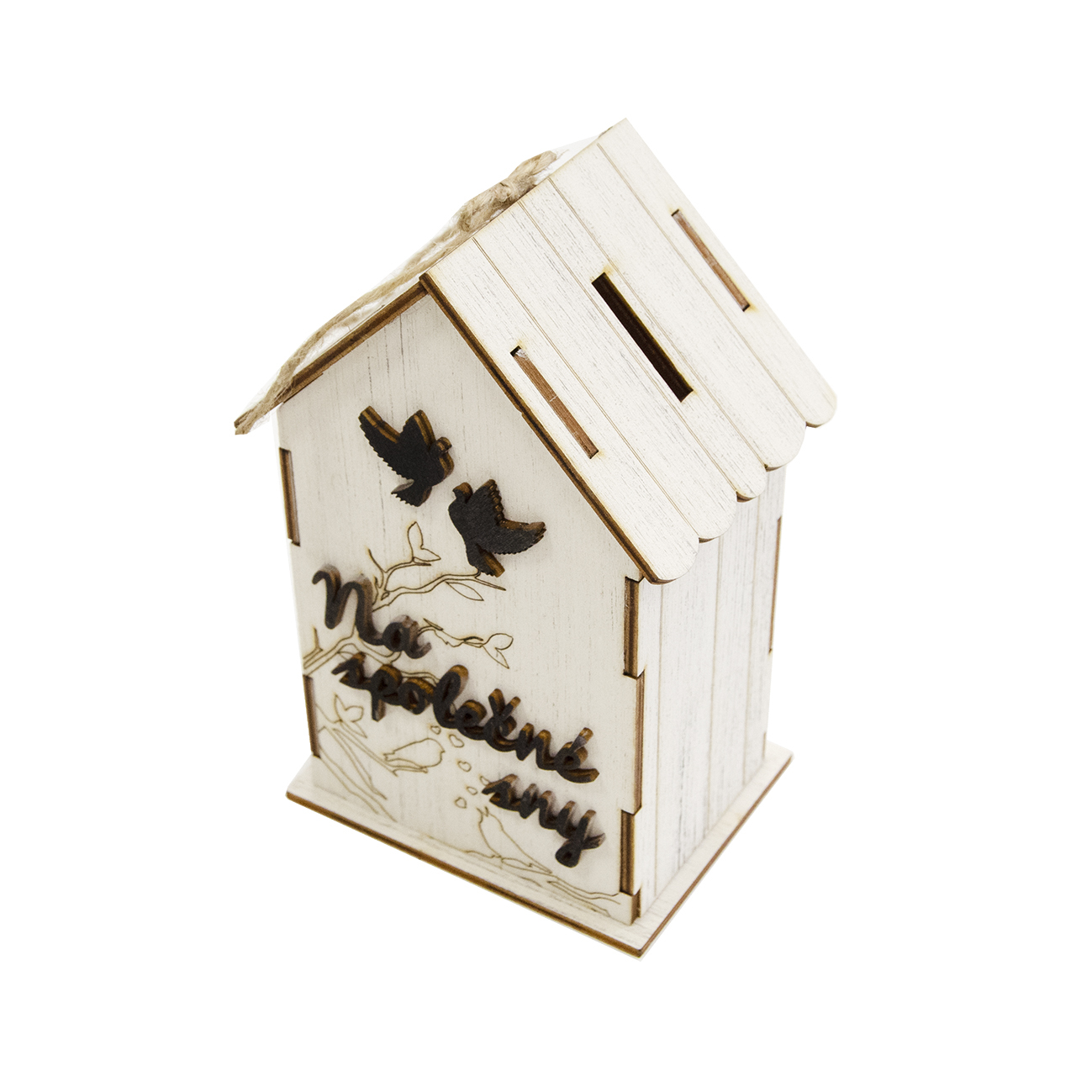 Tato elegantní pokladnička s rozměry 10x16x8 cm je vyrobena ze dřeva v nenápadné bílé barvě, která se hodí do každého interiéru. Na přední straně nese motivační nápis „společné sny“, který vás bude inspirovat k tomu, abyste společně s rodinou či přáteli šetřili na vaše společné cíle a zážitky. Pevná konstrukce a jednoduchý design zajistí, že vám pokladnička dlouho vydrží.