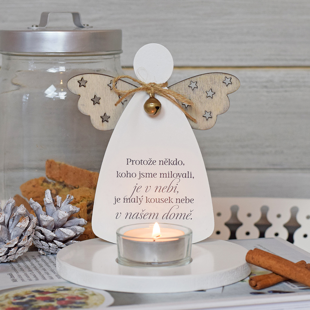 Dřevěný svícen ve tvaru anděla s citátem pro ty, kteří rádi vzpomínají na své blízké.Cena včetně skleněného svícnu na čajovou svíčku velikost: 14,5 x 12,5 cm číst celé
