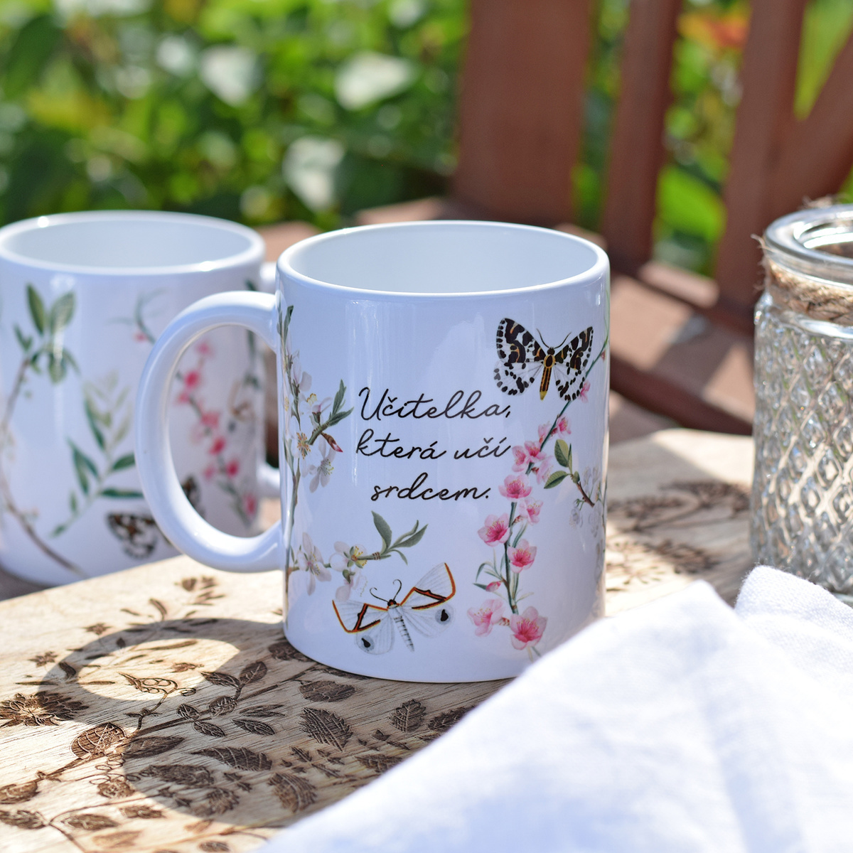 Hrnek s květy a motýly - Učitelka, která učí srdcem.