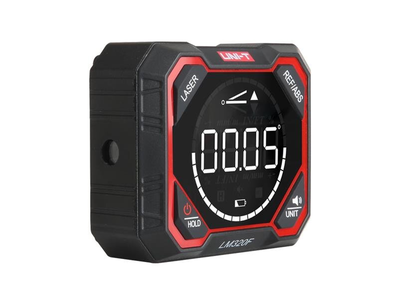 Digitální úhloměr LM320F je lehký a přenosný úhloměr s odolným rámem z hliníkové slitiny, což je zárukou odolnosti při práci. Umožňuje přesně změřit sklon roviny, nahrazuje vlastně vodováhu pro práce ve stavebnictví - při stavbě střech, podlah, kanalizací. Je vybaven displejem s vysokým rozlišením a automatickým otáčením obrazovky, který podporuje celý rozsah měření 4×90°. Zařízení poskytuje údaje o úhlu náklonu v reálném čase a je vybaveno magnetickou základnou pro snadné a stabilní polohování. Základní jednotkou měření je stupeň (°), je však možné zvolit i jiné jednotky: procenta (%), milimetry na 1m délky nebo palce na 1 stopu. Je široce používán v oblasti strojírenství, stavebnictví a mechanických instalací. Přístroj má zabudované tři lasery, které lze jednotlivě zapínat a vypínat a které můžou promítat střed úhloměru např. na stěnu. Přístroj má zabudovaný lithiový akumulátor 3,7V, 1000mAh, který se nabíjí v přístroji přiloženým kabelem USB-C .