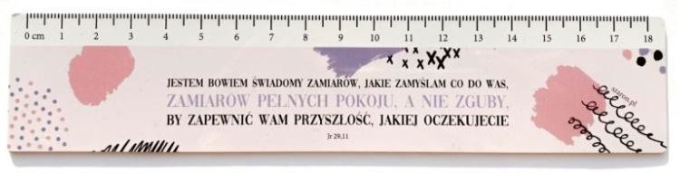 Linijki z fragmentem ze Słowa Bożego dodadzą otuchy lub radości każdym czekającym na nas pomiarom.Linijka przyda się:w dziecięcym piórniku,na sprawdzianie z matematyki,w szufladzie pani domu,przy codziennych wyzwaniach studenta,w precyzyjnych pomiarach każdego czujnego okaPodziałka - 18...