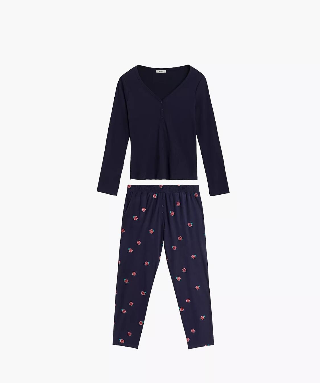Piżama z miękkiej bawełny- koszulka z prążkowanej bawełny- dekolt zapinany na trzy guziczki- spodnie o klasycznym kroju, zdobione kobiecym wzorem w róże- komfortowy ściągacz w talii- praktyczne kieszenie po bokach číst celé