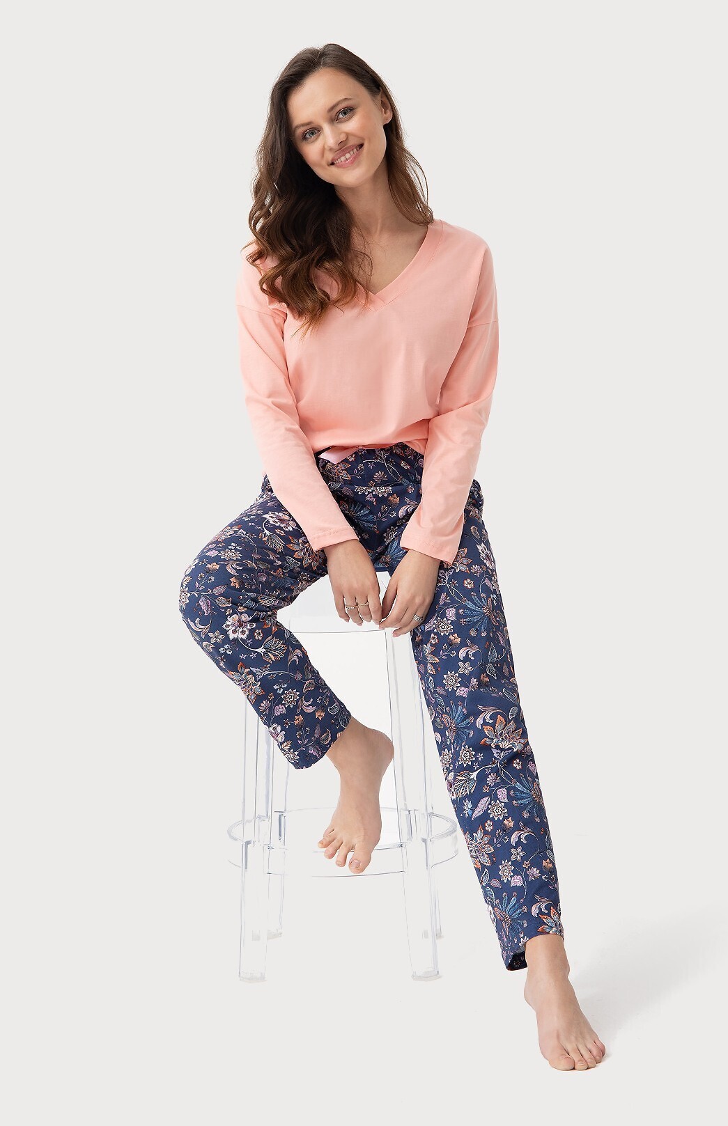 Bawełniana piżama damska- koszulka jednolita z długim rękawem- dekolt w kształcie litery "V"- długie spodnie z efektownym kwiatowym printem- w pasie satynowa kokardka- na biodrach wygodne kieszenie číst celé
