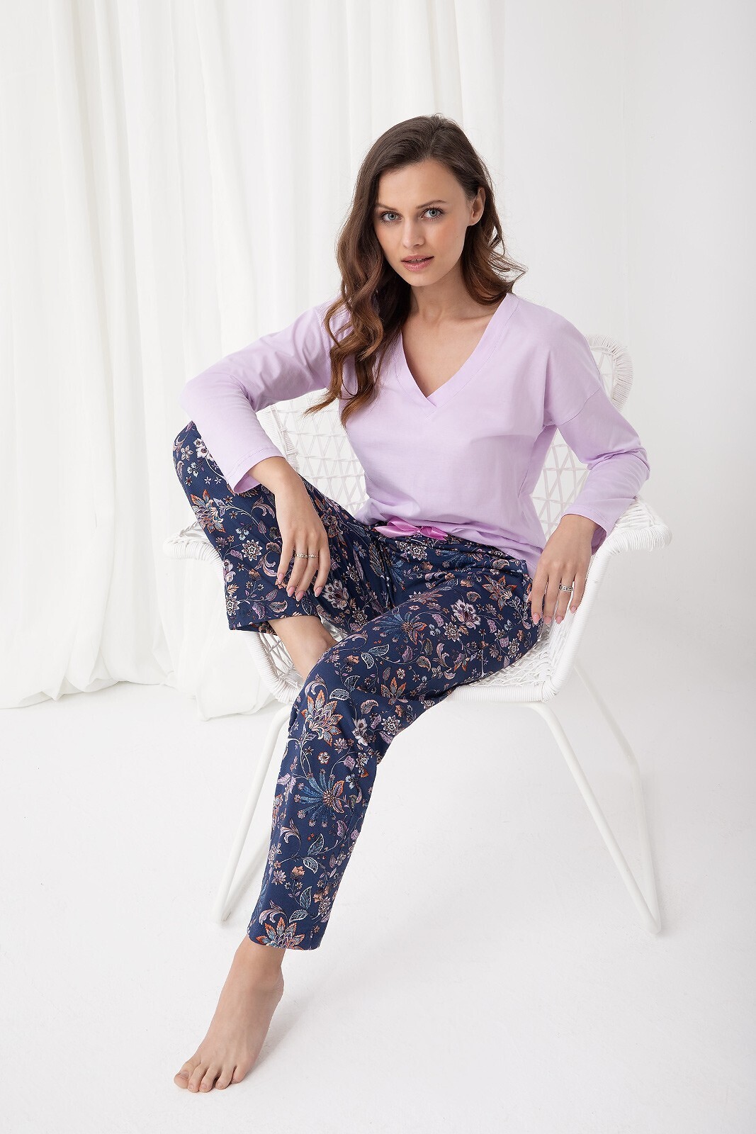 Bawełniana piżama damska- koszulka jednolita z długim rękawem- dekolt w kształcie litery "V"- długie spodnie z efektownym kwiatowym printem- w pasie satynowa kokardka- na biodrach wygodne kieszenie číst celé