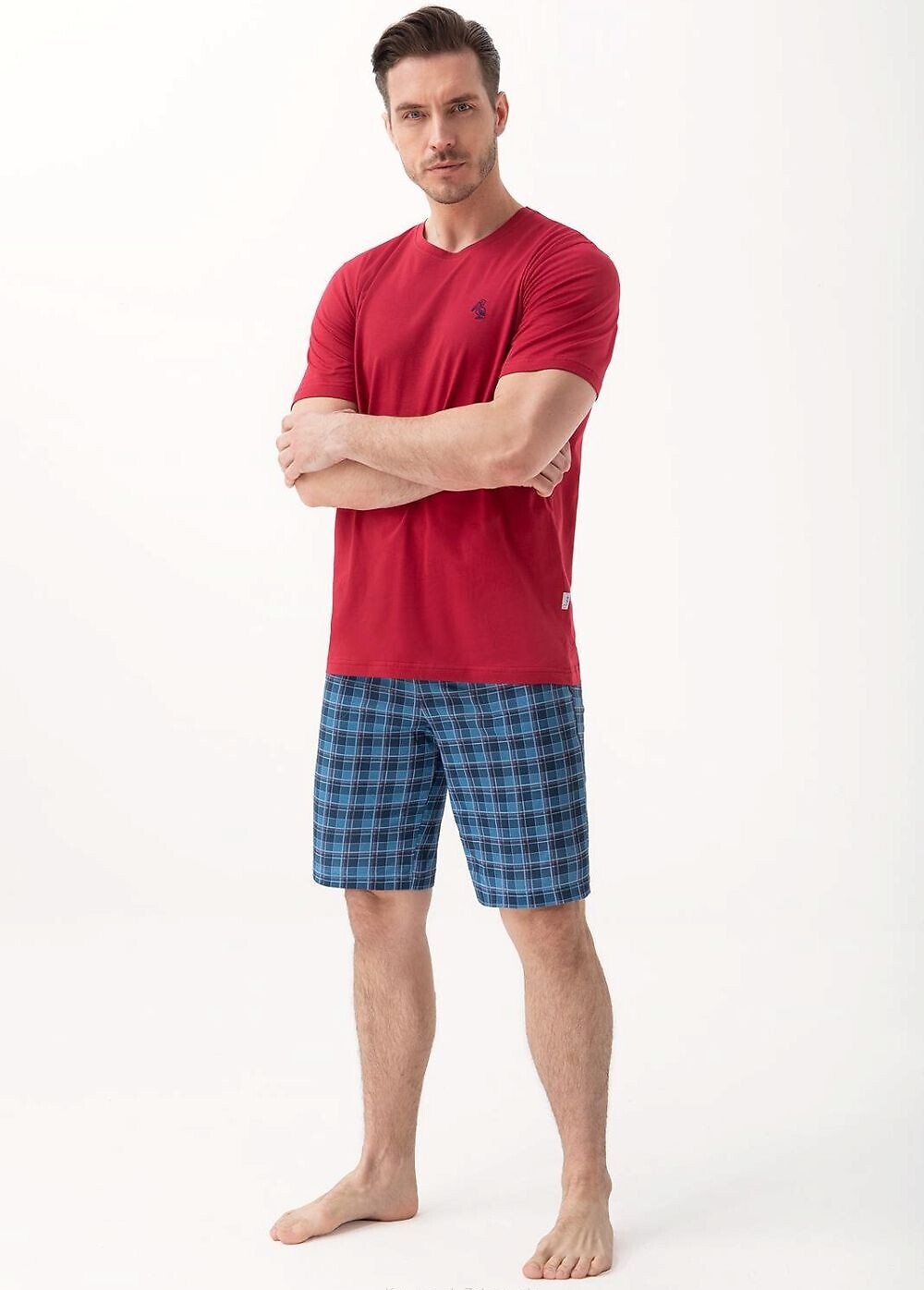 Piżama męska- wysokiej jakości bawełna- koszulka z krótkim rękawem- z przodu delikatny haft pelikana- do kompletu krótkie spodenki w kratkę- po bokach wygodne kieszenie číst celé