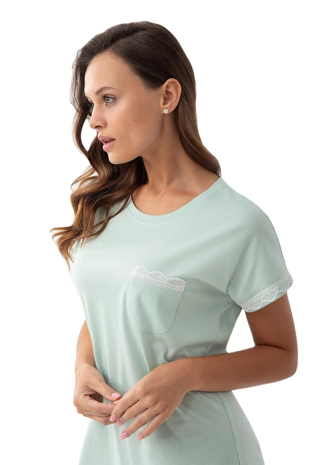Koszula nocna damska- wysokiej jakości jednolita bawełna- krótki rękaw, z naszytą białą koronką- dekolt półokrągły- na piersi naszyta kieszonka- długość do kolan číst celé