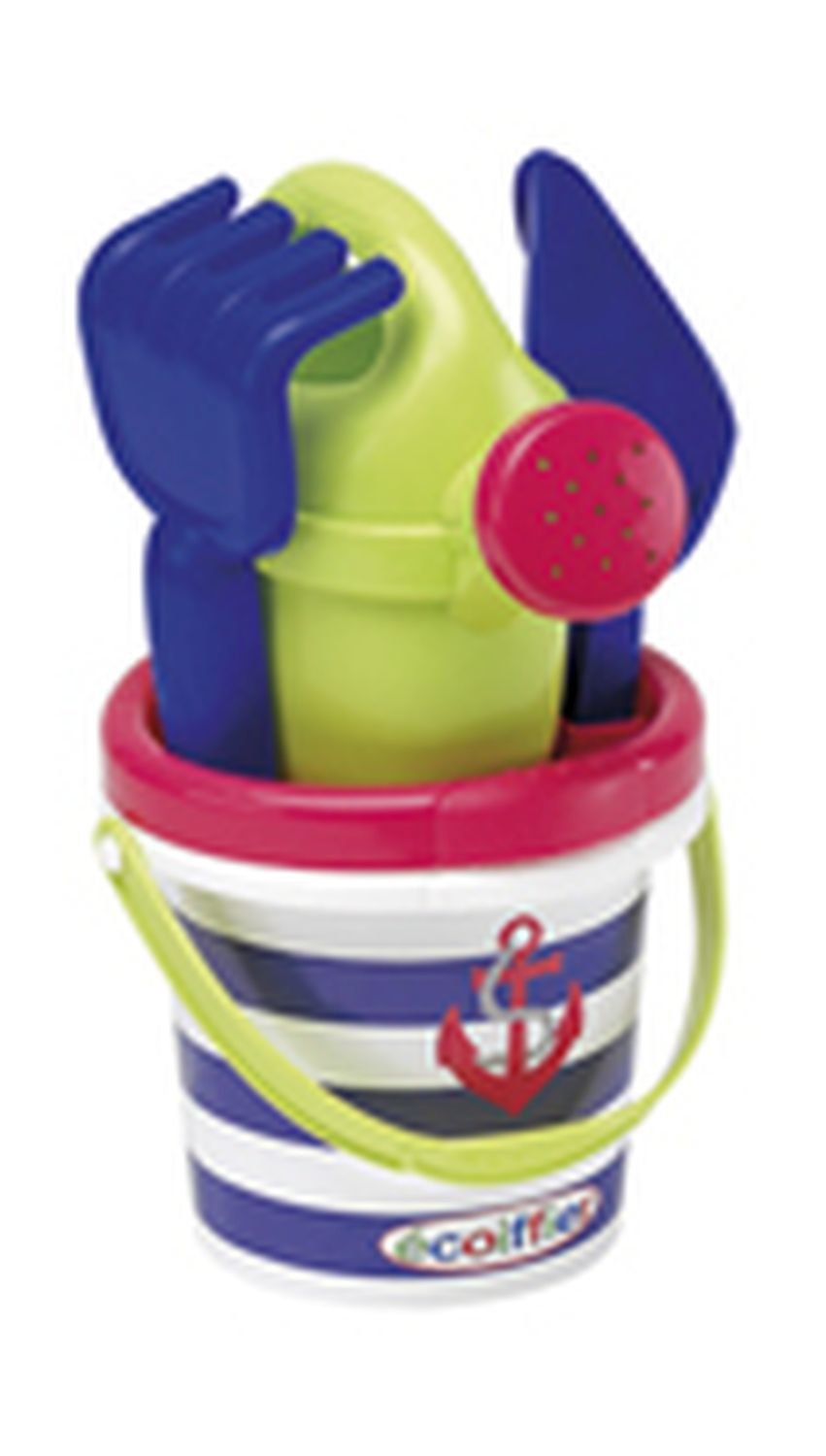 Kyblíček s konvičkou, sítkem, hrabičkami a lopatičkou s obrázkem kotvy. číst celé