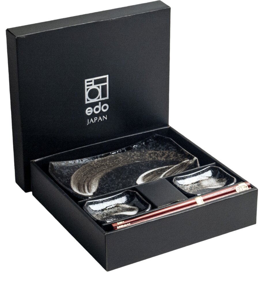 Japonský čtyřdílný set na sushi Ansen ve tmavé barvě. Parametry: Talíře: 22 x 14,5 cm Misky: 9 x 6 cm Hůlky: 22,5 cm číst celé