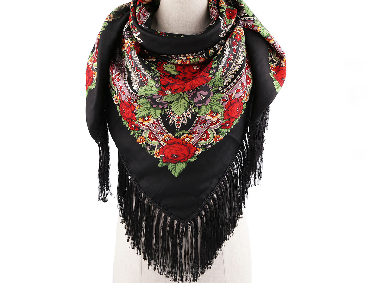 Velký folklórní šátek s motivem květů a třásněmi je vynikajícím doplňkem, který vám přinese nejen styl, ale i příběh našich babiček. Tento autentický šátek skvěle doplní váš outfit a přidá mu nádech nostalgie a výjimečnosti.