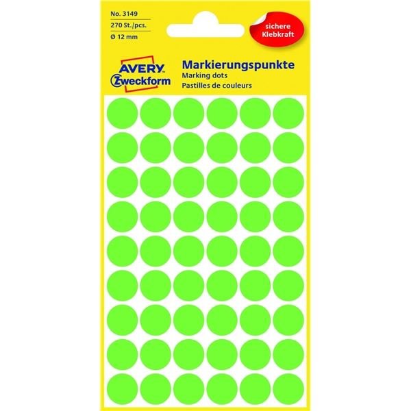 Kulaté etikety Avery, neon zelené, d=12 mm,270 ks