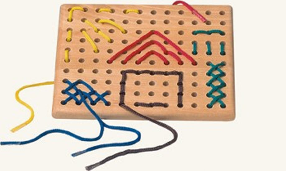 Toto krásné šití na desce je vhodné již pro větší děti, odhaduji tak od čtyř let, které již mají rozvinutou jemno motoriku a vy chcete, aby si jí více procvičili. Jedná se o dřevěnou desku s otvory, do kterých děti provlékají různobarevné tkaničky, není to úplně jednoduché, takže to vyžaduje trpělivost a delší soustředění, není to úplně pro každé dítě, neposedy to moc bavit nebude, ale má to svůj nepopiratelný přínos.