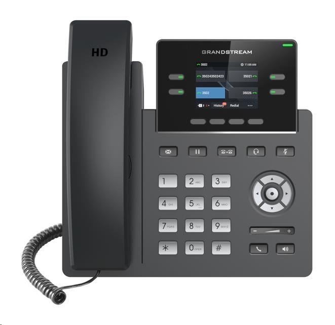 Zařízení Grandstream GRP2612P je dvouřádkový IP telefon podporující až 2 SIP účty a 4 víceúčelové linky. Díky elegantnímu designu a barevnému LCD displeji s rozlišením 320 x 240 pixelů nabízí přehledné a pohodlné ovládání. Přední desku lze snadno vyměnit, což umožňuje například přizpůsobení loga podle vašich představ.