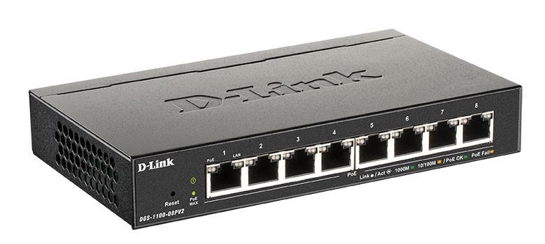 DGS-1100-08PV2D-Link DGS-1100-08PV2 8-port Gigabit Smart Managed PoE switch, 64WD-Link DGS-1100-08PV2 je 8-portový Gigabit Smart řízený PoE přepínač v kompaktním kovovém provedení bez ventilátorů, pro položení na stůl, na poličku nebo montáž na zeď. Všech 8 portů 10/100/1000M RJ-45 podporuje PoE+...